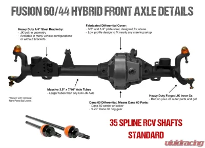 The 60/44 Hybrid provides some seriously strong standard features, including a high clearance reinforced Dana 60 center section, massive 3.5 inch diameter tubes with abuse ready 7/16 inch wall, rock eating 1/4 inch thick brackets, and heavy duty forged inner Cs that are significantly stronger than stock.