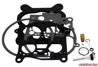 This performance carburetor rebuild kit for Quadrajet carburetors includes complete needle and seat assembly, accelerator pump, fuel filter gasket, choke seals, body to base gasket, air horn gasket, carburetor to intake gasket and air cleaner gasket. The kit will also work on any non-electronic M4 series Quadrajets.