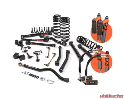 You???ll get a complete setup here: dual-rate coil springs that come in standard or heavy-duty options, an adjustable front track bar, a rear track bar bracket, and tuned FOX shock absorbers. The heart of the kit is the J-Flex upper and lower control arms, along with sway bar quicker disconnects that make off-roading a breeze. This setup not only enhances your Jeep's strength but also allows you to fine-tune the front caster, rear pinion, and overall wheelbase for that perfect ride.