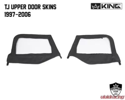 Premium Upper Door Skins Black Diamond Passenger and Driver Side Jeep Wrangler TJ 1997-2006. Features 24 oz Marine Grade Water Proof UV Stable Two Layer Fabric, Pressed and Polished DOT Approved Flexible Glass, Marine Grade Stitching with Heat Sealed Seams, Bindless Self Correcting Nylon Reinforced Zippers with Industrial Grade Velcro Fiber