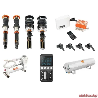 Ksports Executive system has all the features of the Pro Plus kit but adds 4 height sensors that constantly monitor each corner of your vehicle and auto level the ride height while driving. No switches or gauges are needed with this kit and no complex wiring is involved. Instead the kit is operated off a single OLED color screen remote control. The remote displays air tank pressure and front/rear left/right air bag pressure. Four user presets can be saved so you can have quick access to changing your ride height on the fly. The Executive kit offers 4-way adjustability where you can adjust front/rear left/right independently. Memory for engine start will automatically set the ride height you choose. The remote can be charged via standard mini USB and we even include a convenient car charger. Ksports seamless installation control box is standard along with a single Viair 444c compressor (a 2nd compressor can be added for an additional cost). A polished lightweight 5-gallon air tank is another welcomed upgrade from our Basic and Deluxe kits. A standard 4 button remote control is also included as a backup in case the battery dies on the OLED remote. Professional installation is recommended. All Ksport Airtech Systems feature high quality air bags, proven to handle the stress and abuse of daily driving as well as drift circuit use. Take advantage of the near infinite adjustability thanks to the adjustable lower mount, 36 levels of damping adjustment, and the unmatched height adjustability (0-120/200mm depending on vehicle) of air suspension. Ksports air suspension kits are designed for easy bolt-on installation. No modifications to OEM shock absorbers, or OEM top mounts is required. Vehicle may need to be modified for air-line routing. All Ksport Airtech Systems use a VIAIR compressor and can be raised from the lowest setting to max height in as little as 2 seconds*. All hoses, fittings, wiring, and installation manuals are included.