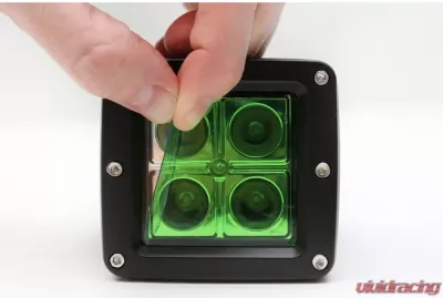 One universal 2" x 2" LED driving lamp Green film cover. Protects & covers your LED light from damaging road debris. These green protective film covers are made in the USA, adhesive-backed, impact-resistant, and 12 mils thick to ensure that your lights are protected for many years to come. This green color projects a bright green light from your the lights. The adhesive on the Lamin-x films are designed to be extremely forgiving. You can apply numerous times during initial application to get the installation right.