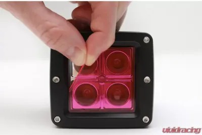 One universal 2" x 2" LED driving lamp Pink film cover. Protects & covers your LED light from damaging road debris. This bright pink color projects a bold pink color when unlit and lit. The Lamin-x pink protective films are made in the USA, impact-resistant, 12 mils thick, and adhesive-backed to protect your lights from cloudiness that occurs over time and road debris. The adhesive on the Lamin-x films are designed to be extremely forgiving. You can apply numerous times during initial application to get the installation right.