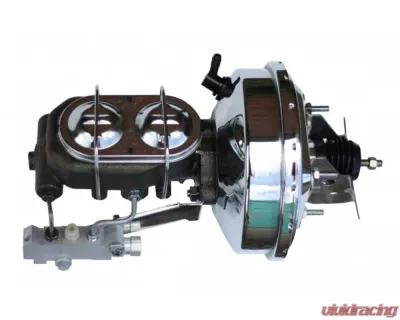 New 9" chrome plated power brake booster, master cylinder & disc/drum proportioning valve combo. This 9" power booster is hand polished before a chrome finish is applied for a top quality finish. The top quality power brake booster is designed mount directly to your factory firewall. Also included in this kits is a new 1-1/8" bore master cylinder and proportioning valve equipped to work with front disc / rear drum applications.
