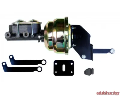 New 8" Dual Diaphragm zinc plated power brake booster kit. This 8" power booster is hand polished before a yellow zinc finish is applied for a top quality finish. The black powder coated mount and pushrod assembly is a direct fit to your factory firewall for that fresh factory look. Also Included in this kit is a new 1-1/8" bore master cylinder perfect for most front disc /rear drum or 4 wheel disc brake applications.
