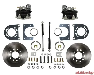 Add the safety, reliability and performance of rear disc brakes to your vehicle with our drum to disc brake conversion. In this kit you receive everything you need to mount single piston disc brakes to your Ford 9" Large Bearing Bearing Rear Axle. All components used in these kits are new high quality, precision machined products with a zinc plated finish to reduce corrosion and extend the life of your brake system. The heavy duty parking brake caliper will allow you to use your stock parking brake cables to actuate your parking brake.