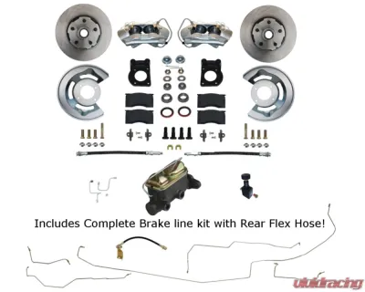 Add the safty, reliability and performance of disc brakes to your vehicle with our drum to manual disc brake conversion. In this kit you recieve everything you need to mount factory style 4 piston disc brakes to the original drum brake spindles currently on your vehicle. This kit is a direct bolt on with NO cutting, drilling or welding required. All components used in these kits are new high quality, precision machined products. Also included in this kit is a complete pre-bent brake line kit that fits with both single or dual exhaust applications. A great kit with a factory look and easy installation! Note: Fits 64-69 V8 drum brake spindles. Also fits 67-69 6cyl spindles but converts the vehicle to 5 lug.