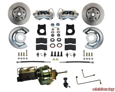 Add the safety, reliability and performance of disc brakes to your vehicle with our drum to power disc brake conversion. In this kit you receive everything you need to mount factory style 4 piston disc brakes to the original drum brake spindles currently on your vehicle. This kit is a direct bolt on with NO cutting, drilling or welding required. All components used in these kits are new high quality, precision machined products. A great kit with a factory look and easy installation! Note: Fits 64-69 V8 drum brake spindles. Also fits 67-69 6cyl spindles but converts the vehicle to 5 lug. Kit will only fit vehicles with automatic transmission. Will fit most manual shift cars equipped with aftermarket cable style clutch.