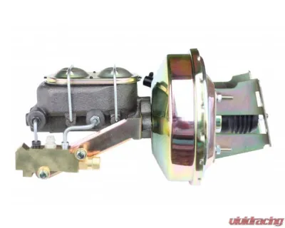 New 9" zinc plated power brake booster, master cylinder & disc/disc proportioning valve combo. This 9" power booster is hand polished before a yellow zinc finish is applied for a top quality finish. The top quality power brake booster is designed mount directly to your factory firewall. Also included in this kits is a new 1-1/8" bore master cylinder and proportioning valve equipped to work with 4 wheel disc applications.
