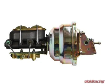 New 8" Dual Diaphragm zinc plated power brake booster, master cylinder & disc/drum proportioning valve combo. This 8" power booster is hand polished before a yellow zinc finish is applied for a top quality finish. The top quality power brake booster is designed to mount directly to your factory firewall. Also included in this power brake booster kit is a new 1-1/8" bore master cylinder and proportioning valve equipped to work with front disc rear drum applications.