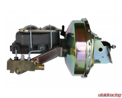 New 9" zinc plated power brake booster, master cylinder & disc/drum proportioning valve combo. This 9" power booster is hand polished before a yellow zinc finish is applied for a top quality finish. The top quality power brake booster is designed mount directly to your factory firewall. Also included in this kits is a new 1-1/8" bore master cylinder and proportioning valve equipped to work with disc/drum brake applications.