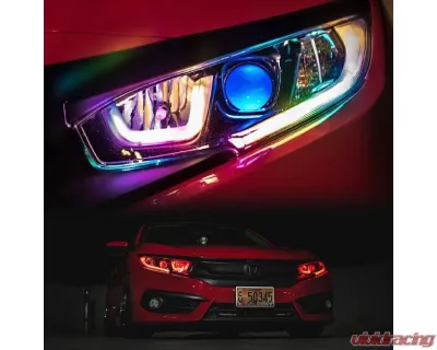 These RGBWA/Flow Series DRL will take your vehicle to the next level! Featuring full color functionality like our RGB products, HOWEVER, this kit also offers a solid white output in comparison to our Colorwerkz which has more of a blue tone, along with switchback functionality for your turn signals! You'll have the ability to transform your headlights with the click of a button. Cycling through hundreds of different modes and functions, the color combinations are virtually endless. You'll definitely make your competition think twice before pulling up next to you!