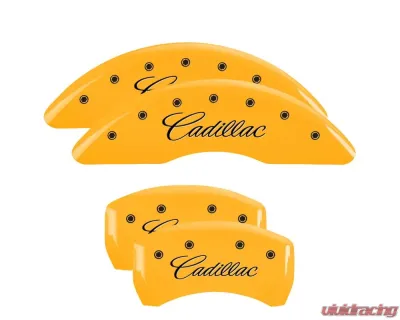 Crafted in the USA from T-6061 aerospace grade aluminum, the MGP Caliper Covers are TIG welded for added strength and durability. Each cover is finished with a vibrant yellow powder coat that is resistant to wear and tear, ensuring they maintain their striking appearance over time. The black cursive Cadillac logo is elegantly engraved on both the front and rear covers, providing a sleek contrast against the bright yellow finish.