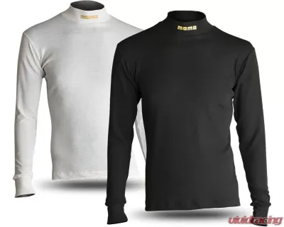 MOMO Comfort Tech fire retardant high collar shirt provides excellent protection and maximum comfort from its premium jersey material. Available in black or white, FIA approved.
