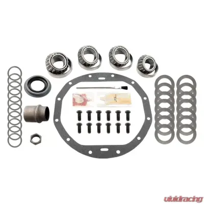 For GM 8.875" (12 Bolt); Master Bearing Kit Includes Timken Tapered Bearings (Carrier, Front and Rear Pinion, Pilot where applicable), Brush, Cover Gasket (or RTV), Crush Sleeve (or Preload Shim Pack), Marking Compound, Pinion Nut, Pinion Seal, Ring Gear Bolts, Shims (Pinion, Carrier), and Thread Locking Compound