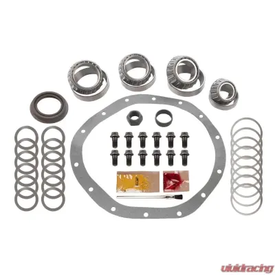 For GM 9.5" (14 Bolt); Master Bearing Kit Includes Timken Tapered Bearings (Carrier, Front and Rear Pinion, Pilot where applicable), Brush, Cover Gasket (or RTV), Crush Sleeve (or Preload Shim Pack), Marking Compound, Pinion Nut, Pinion Seal, Ring Gear Bolts, Shims (Pinion, Carrier), and Thread Locking Compound