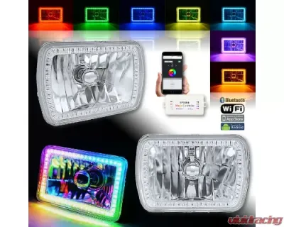 Two 7X6 Inch Crystal Clear Glass Faced / Metal Backed Halogen Headlamp Bulbs With SMD RGB Color Chasing Led Halo Angel Eye Rings. These Headlights Include Xenon Super White Halogen 60/55W H4 Bulbs And A Bluetooth Controller.
