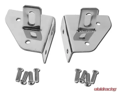 Easily add auxiliary lights with RT Off-Roads Windshield Light Mount Brackets. Brackets mount to the vehicle using existing holes in the windshield frame. Each set is constructed of stainless steel and polished to a mirror finish. Kit includes all hardware needed for installation.