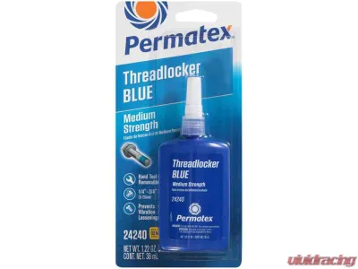 Permatex?s Medium-Strength Threadlocker Blue is ideal for all nut and bolt applications 1/4? to 3/4? (6mm to 20mm). Threadlocker Blue eliminates need for stocking expensive lock nuts and lock washers and locks and seals while preventing parts loosening due to vibration. Protects threads from corrosion. Threadlocker BLUE is easily removable with hand tools for easy disassembly. (Mil-S-46163A, Type II, Grade N).