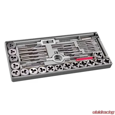 This 40 piece set comes complete with the most popular sized taps, dies and accessories and can cut and repair damaged threads on nuts, bolts, and internal threaded holes on most metals. Complete with tap and die handles, a screwdriver, and a screw pitch gauge all organized in a handy carrying case.