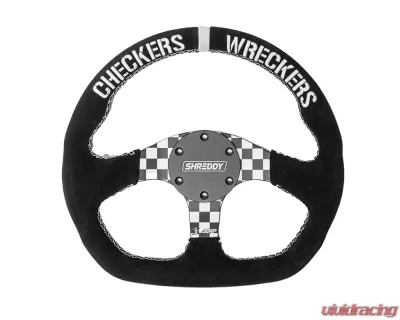 Wreck'em and Check'em with this Limited Edition PRP X Shreddy Lyfe Collab Wheel. This D Shaped or Flat Bottom Steering Wheel features a black suede band superior grip, Checkers-Wreckers embroidered across the top, and the checkered board pattern on the spokes with PRP and Shreddy logos.