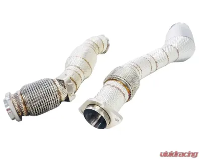 Our new Gen2 Racing Dynamics sport catted downpipes with heat shields for BMW X3M (f97) and BMW X4M (f98) 2019 on models. Our Gen2 Downpipes include improvements in flex joint to reduce vibration and allow alignment during installation, O2 sensor bungs for reinstallation of the OE O2 oxygen sensors, and mounting brackets to support the weight. Down-pipes by there very nature reduce restrictions of the catalytic converters allowing your turbos to breath more efficiently. This reduced restriction allows the turbos to spool up more quickly and provide a more aggressive turbo sound. Most downpipes since they no longer have catalysts may generate check engine lights. Our O2 sensors spacer is a possible solution.