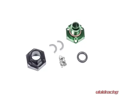 Look for the green upper fitting to identify this pump outlet adapter. It's designed to be as compact as possible without compromising flow, making the 20-0298 model 0.42" shorter than the 20-0599 version. This means you can enjoy improved performance without worrying about taking up extra space in your engine bay.