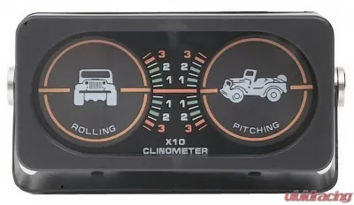 Clinometer has a two gauge design offering side-by-side angle and front-to-back angle. The graphic read outs show precise angle in degrees and gauges illuminated for night vision.