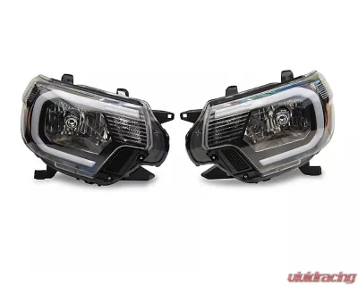 Improve the appearance and nighttime driving visibility of your 2012-2015 Toyota Tacoma just by replacing your old weathered, worn out, and yellowing factory headlights with a brand new pair of Axial Headlights that feature black housings and clear lenses. With an impressive LED Daytime Running Light (DRL) design, these Headlights will give your Tacoma a whole new look.Manufactured from OEM grade materials, these Headlights are assembled to precise standards for long-lasting quality. These Headlights feature durable, black ABS plastic housings with multi-faceted chromed reflectors, clear polycarbonate lenses, and modern LED lighting. Each housing is weather-sealed to prevent dirt and moisture from harming the state of the art electronics found inside.These Headlights were designed to be a direct plug and play replacement for your vehicle's original factory housings. The DRL light bar portion of the headlight will require splicing into your running lights for operation. Please be sure to have your headlights properly aimed/aligned before driving at night.Features :