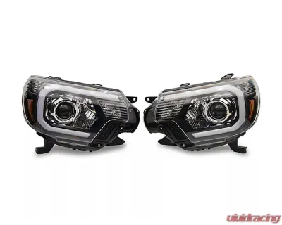 Add an updated contemporary appearance to your 2012-2015 Toyota Tacoma, all while improving your nighttime visibility with a pair of Axial LED Projector Headlights that feature black housings and clear lenses. With an impressive LED Daytime Running Light (DRL) design, these Headlights will give your Tacoma a whole new look.Utilizing a projector lens design, these Headlights will light up the road ahead with a bright focused beam for better nighttime visibility. The white Daytime Running Light (DRL) Bar accents not only look great, but will also ensure that you are visible to distracted drivers day or night.Manufactured from OEM grade materials, these Projector Headlights are assembled to precise standards for long-lasting quality. These Projector Headlights feature durable, black ABS plastic housings with crystal clear polycarbonate lenses and modern LED lighting. Each housing is weather-sealed to prevent dirt and moisture from harming the state of the art electronics found inside.These Headlights were designed to be a direct plug and play replacement for your vehicle's original factory housings. The DRL light bar portion of the headlight will require splicing into your running lights for operation. Please be sure to have your headlights properly aimed/aligned before driving at night.