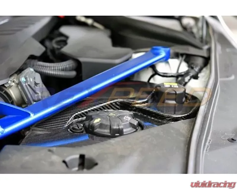 This coolant cover is made from light weight super strong vacuum bagging carbon fiber construction. Great way to enhance your engine bay with this piece.