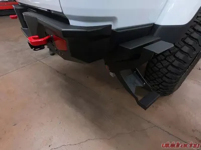 With a push of a button, you can deploy the step which will provide a two tier stepping platform to climb up. When you push the button it will retract into a folded, tucked away position that does not reduce the departure angle of a Jeep Gladiator.
