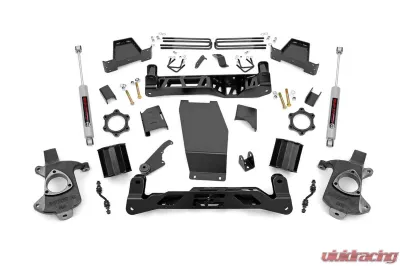 The Rough Country 6-inch Suspension Kit (Part #22731) is engineered specifically for the 2014-2018 Chevrolet Silverado 1500 and GMC Sierra 1500 4WD models. This kit is designed to enhance your truck's capabilities while maintaining a factory-like ride quality. With this suspension upgrade, you can fit up to 33-inch tires on your stock wheels, giving your vehicle a more aggressive stance without compromising performance.