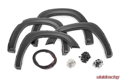 The Rough Country F-D10914A-PB8 Pocket Fender Flares provide a robust aesthetic upgrade for your Ram 1500 (2019-2024). Designed for those who appreciate both style and functionality, these flares feature a simulated riveted look that complements a lifted stance and larger tires.