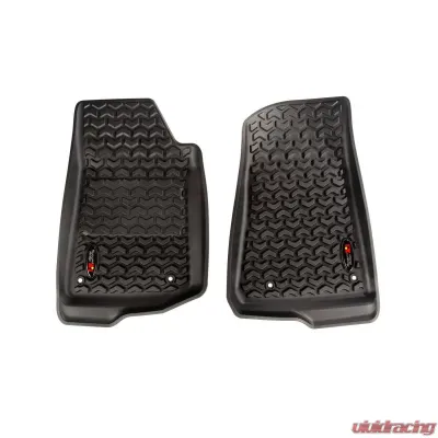 Rugged Ridge Floor liners provide complete protection for the cabin floor of your vehicle while keeping it looking factory fresh. Each liner is injection molded to keep it's shape in all temperatures and is perfectly contoured to your vehicle's floor for precise secure fitment (floor hook attachment where applicable). The raised lip captures all spills, water and debris keeping your interior pristine. The Chevron-shape patented Deep Tread Technology channels liquid away from your shoes keeping them dry. Made of a durable OE-quality thermoplastic material that can withstand the rigor of daily abuse. Backed by our Limited Lifetime Warranty. Patent 8,173,369, D627,285