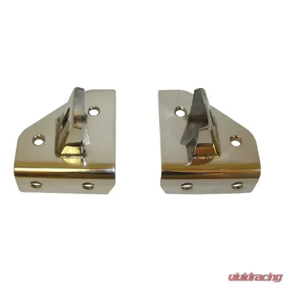This pair of stainless steel windshield auxiliary light mounting brackets from Rugged Ridge bolt to the factory windshield hinges.