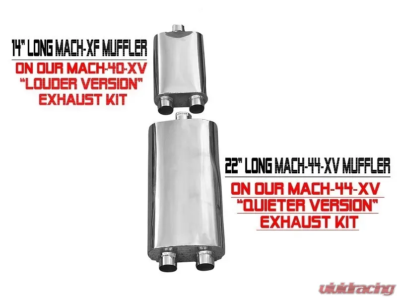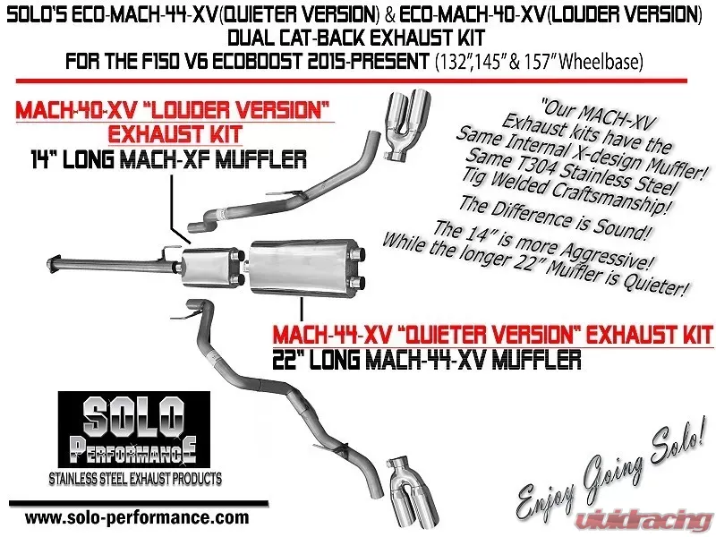 These are a "Sound on Demand" exhaust system that produces the sound you want when accelerating or revving but becomes much quieter at cruise speeds. Solo has replaced that annoying cruise speed cabin drone with a comfortable, non-invasive exhaust note through advanced technology and a painstaking R&D process. These kits start out with a 3" exhaust pipe and then go to a single in dual out muffler. The Both mufflers are heavily packed with stainless steel wool and ceramic fibre and the smaller Mach-40 muffler produces a 60's muscle car sound with more volume than the Mach-44. The system then splits into dual 2 ½" mandrel bent tailpipes (no need to remove the spare tire with the Solo kit) and ends with T304 stainless steel dual tips behind the rear wheels. Fit, form and function are the cornerstones of the Solo exhaust kits.