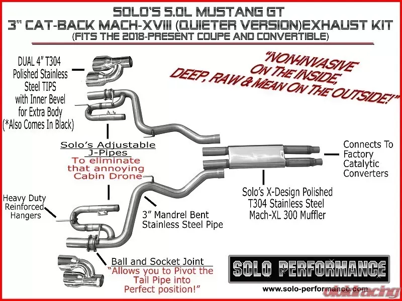 Solo has replaced that annoying cruise speed cabin drone with a comfortable, non-invasive exhaust note through advanced technology and a painstaking R&D process. Solo's 2015 , 5.0L Mustang GT MACH-XV exhaust kit comes with an 18 inch long mid X-Muffler and Solo's rear tunable J-Pipes. These J-pipes are capped off on the end and as the sound waves enter the J-pipe, they bottom out on the end cap and bounce back. Upon the sound wave re-entering the exhaust flow, it collides with the specific Mustang GT drone frequency and cancels it out. The Solo Tailpipe section has been built with ease of installation in mind. The pivotal, telescoping tailpipe assembly gives you an easy way to center the dual tips the first try. You can choose from the standard T304 polished stainless steel tips or upgrade to the black tips. Experience 60's muscle car sound on the outside and a non-invasive exhaust note on the inside with Solo Performance MACH-XVIII 3" mandrel bent stainless steel Mustang cat-back exhaust kit... tomorrow's technology on today's Mustang GT.