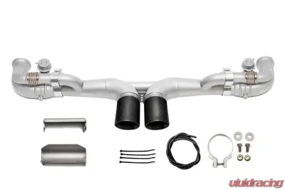 DEVELOPMENT AND TESTING:SOUL was approached to create an exhaust solution to maximize the sound and weight reduction of the exhaust system while maintaining reasonable cabin presence and investment. We took this one step further by making this solution modular by combining our side and center muffler deletes. This means you can easily mix and match the system with the factory center muffler or side mufflers to experiment with different sound characteristics of the car and reduce or increase overall sound level. As deleting the factory center and side mufflers at the same time inherently deletes the factory support brackets, we created bespoke support brackets for this combination of components. This system is available in a non-valved and valved configurations. The valved configuration maintains factory PSE button control. With valves closed, 100% of the exhaust is channeled through smaller diameter piping before entering the expansion chamber of our center muffler bypass. This will make a notable difference in sound level on the exterior of the car, though will be less noticeable in the cabin of the car. The expansion chamber design of our center muffler does a great job at reducing drone/vibration in cabin, and has the most reasonable cabin presence of any Straight Pipe headerback/catback configuration we have experienced on the GT3 platform.