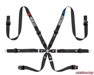 Sparco?s full line of harnesses works in unity with our competition seats. Crafted from high-quality fabric and fitted with durable fasteners, each harness restrains the body for added safety and protection. Our Prime 6-point Hans-compatible harness features 2-inch lap straps and shoulder straps. Each strap attaches in the center using an aircraft-quality quick-release buckle with integrated anti-submarine belts. The lightweight steel adjusters allow for smooth, quick adjustments and perfect clamping. Shoulder and Sub staps attaches to the frame using snap-on fixings which can be removed for roll bar attachment. Light-weight carabiner fastners are included for the lap belts. Available three colors: black, blue and red. This harness is FIA approved.