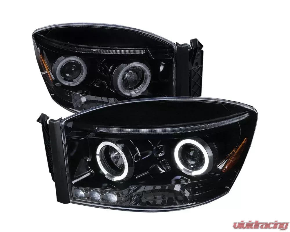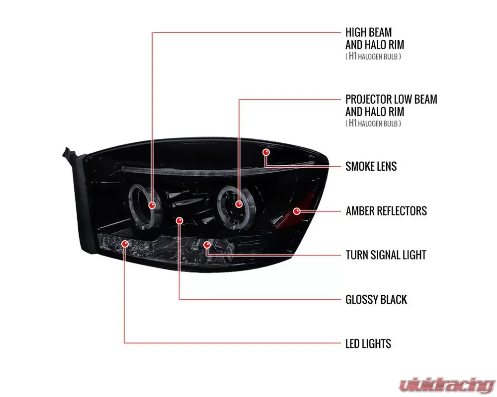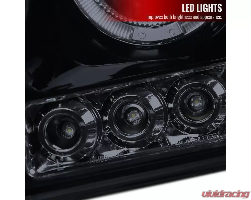 - Glossy black housing, smoked lens dual halo projector headlights with LED accent lights