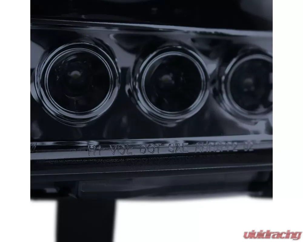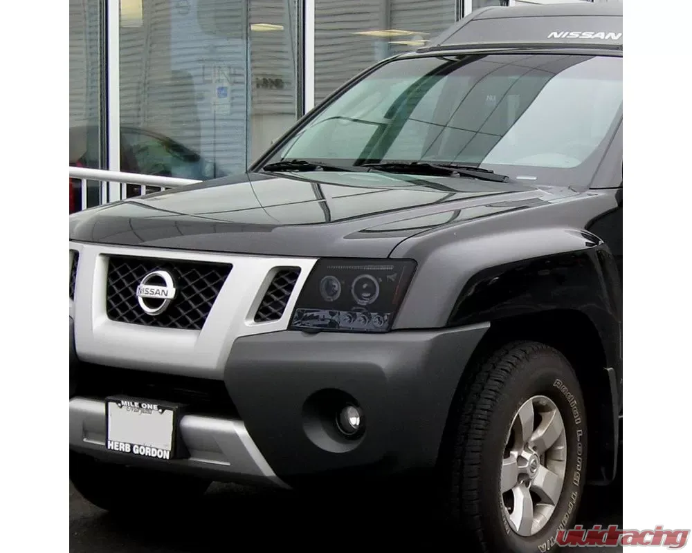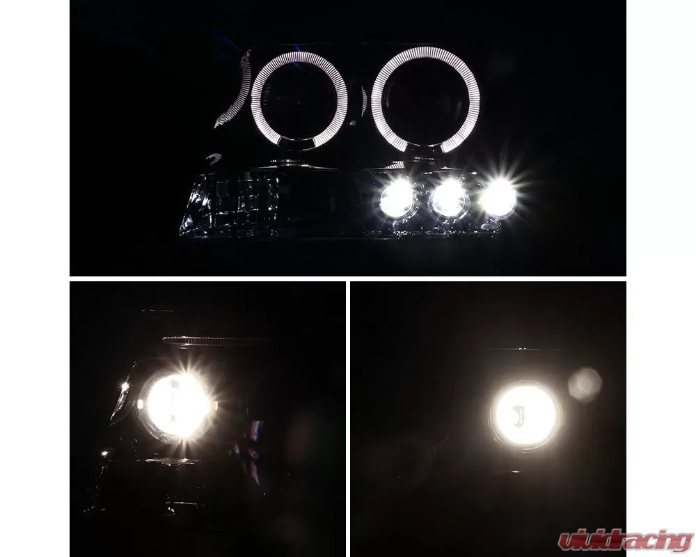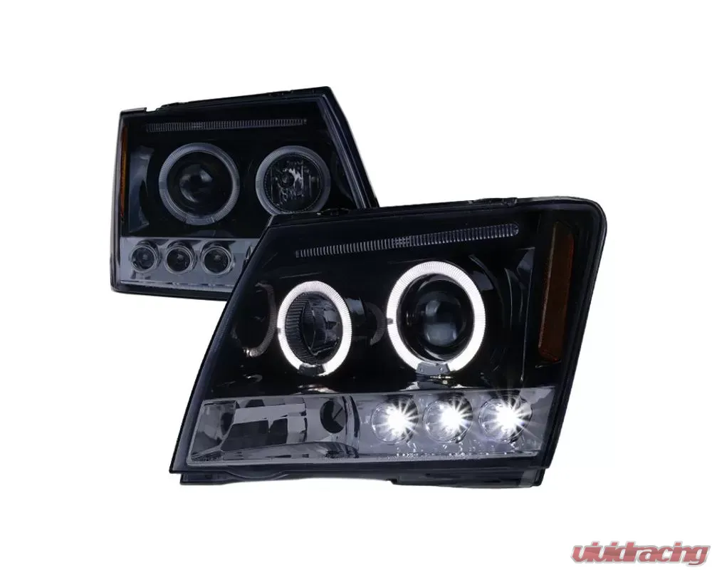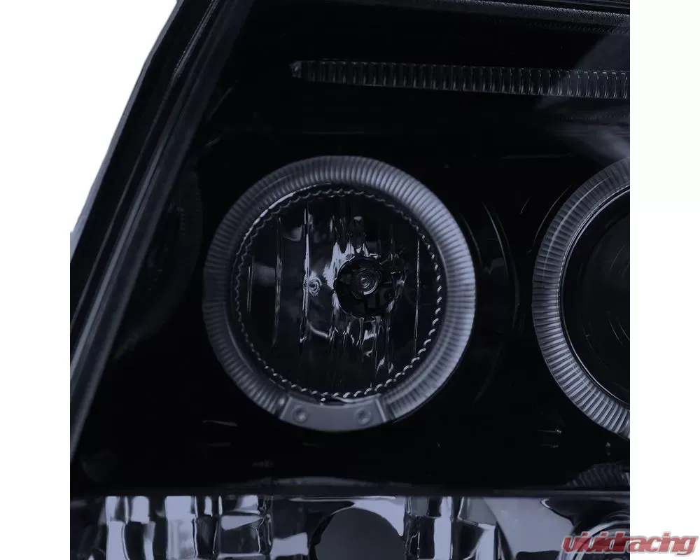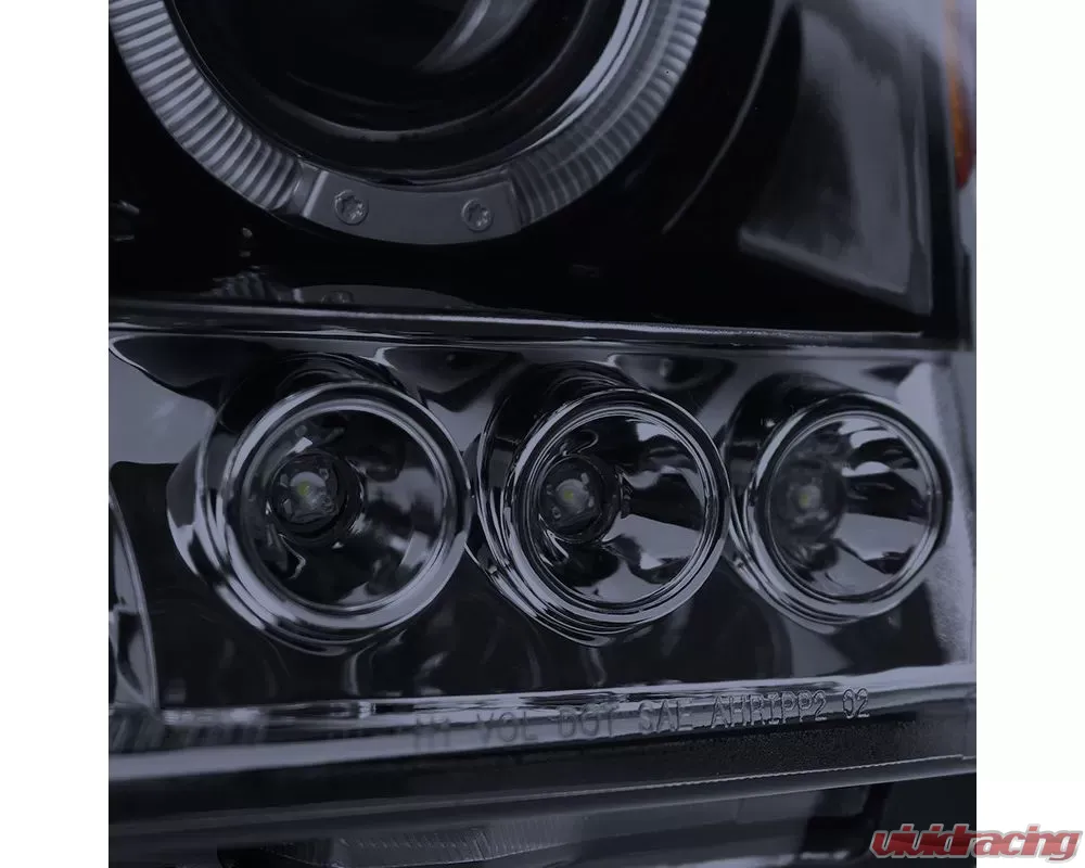 - Glossy black housing, smoked lens dual halo projector headlights with LED accent lights
