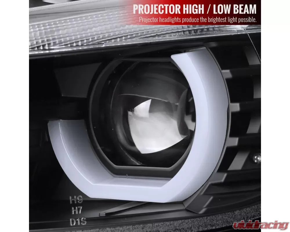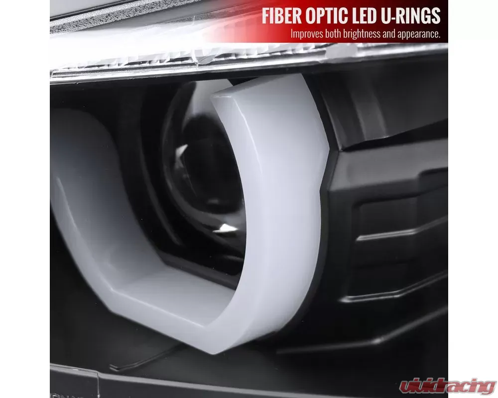 - Matte black housing, clear lens dual U-bar projector headlights with LED light strip & LED turn signal lights