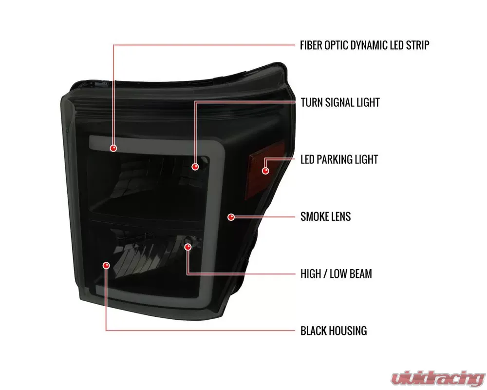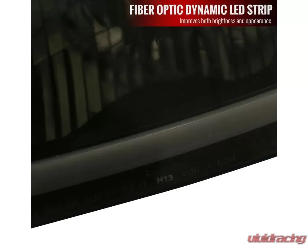 - Comes with (1) pair of factory style headlights with fiber optic LED C-Bar with start up animation in a black housing with smoked lens and amber reflector