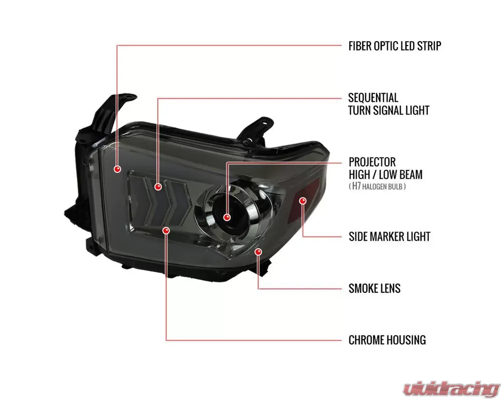 - Comes with 1 pair of chrome housing smoke lens projector headlights with LED C-bar & sequential arrow turn signal lights