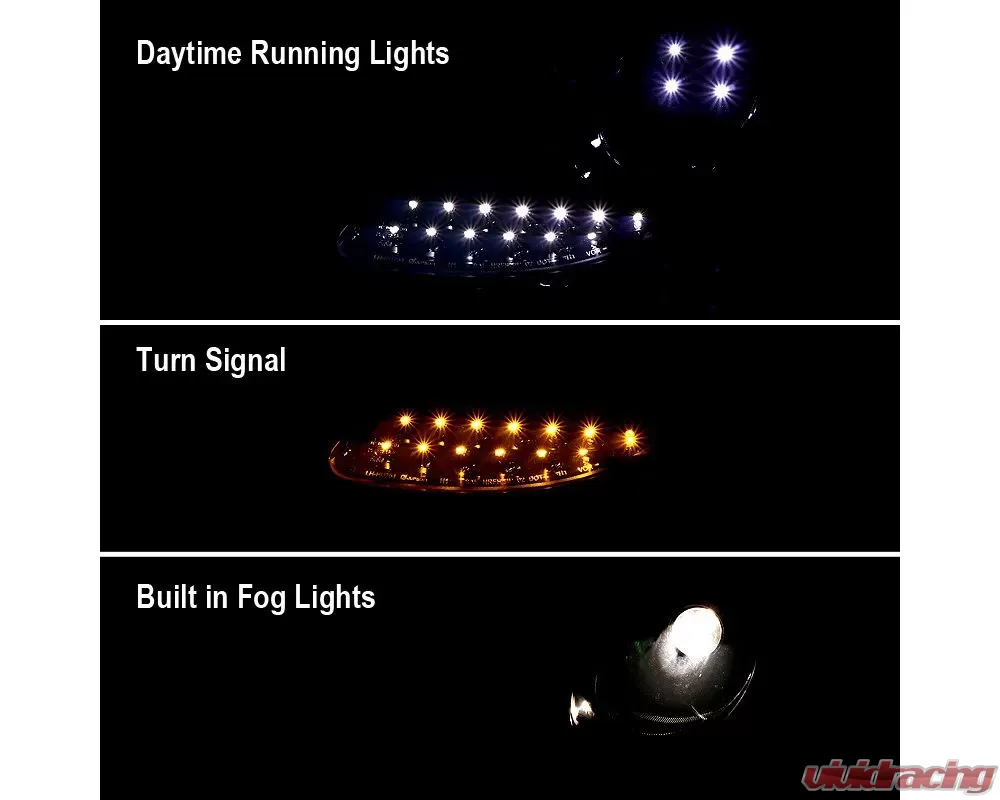 - Comes with 1 pair of black housing clear lens projector headlights with LED light strip & LED turn signal lights