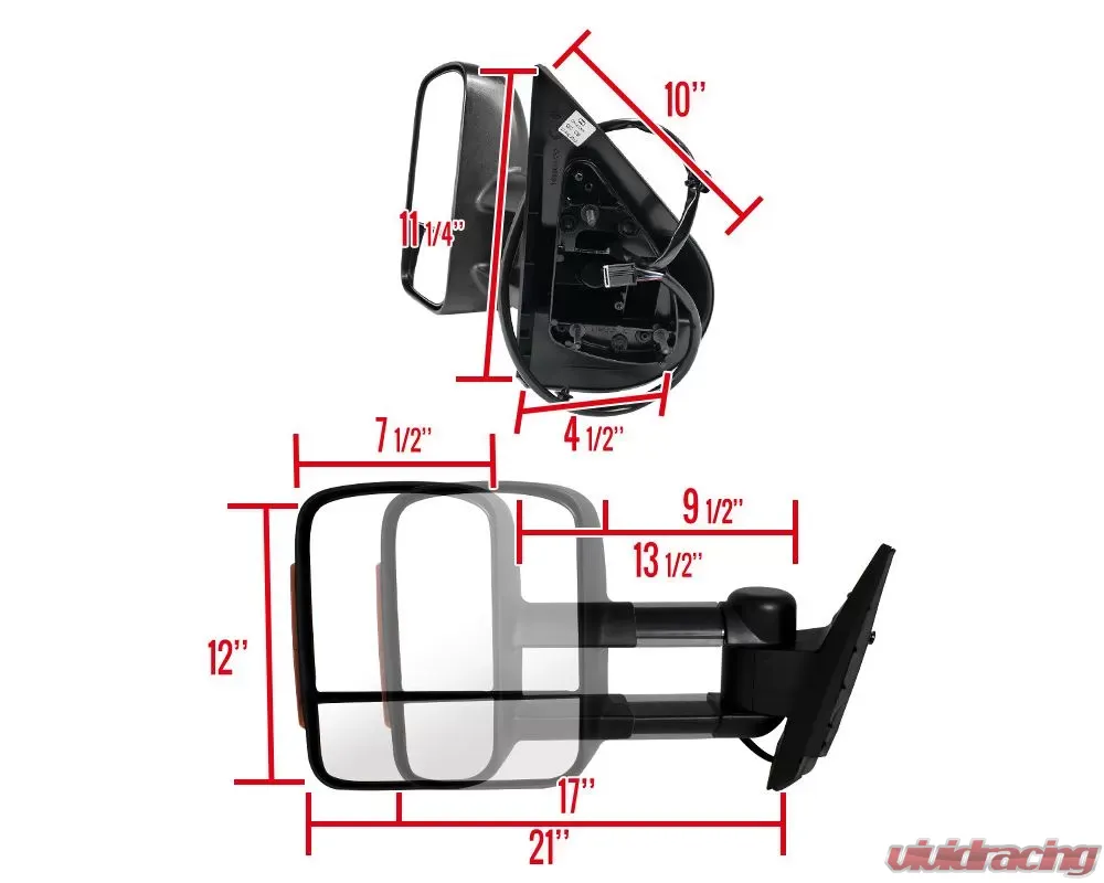 - 12 x 7.5 power adjustable mirrors with manual extended telescoping wide-angle mirrors with convex mirror glass underneath, plus smoked lens LED signal lights