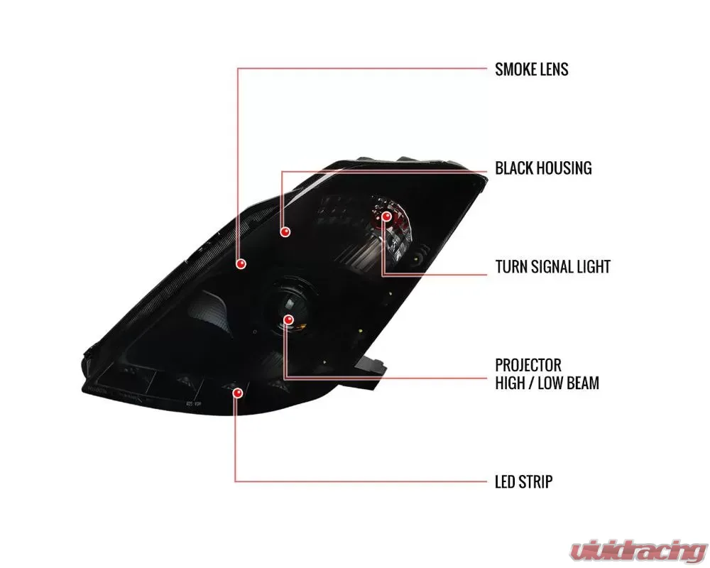 - Comes with 1 pair of black housing smoked lens projector headlights with bRight white LED light strip