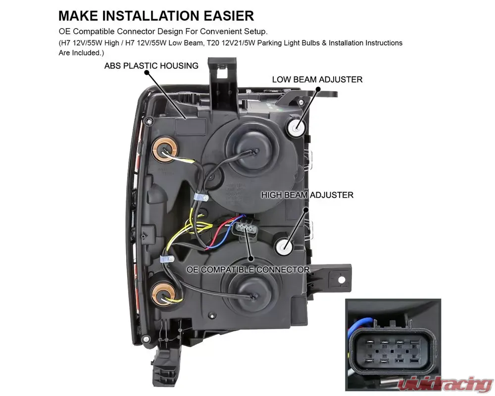 - Bulbs included - H7 12v / 55w light bulbs for projector beam / T20 12V21 / 5W parking light bulbs