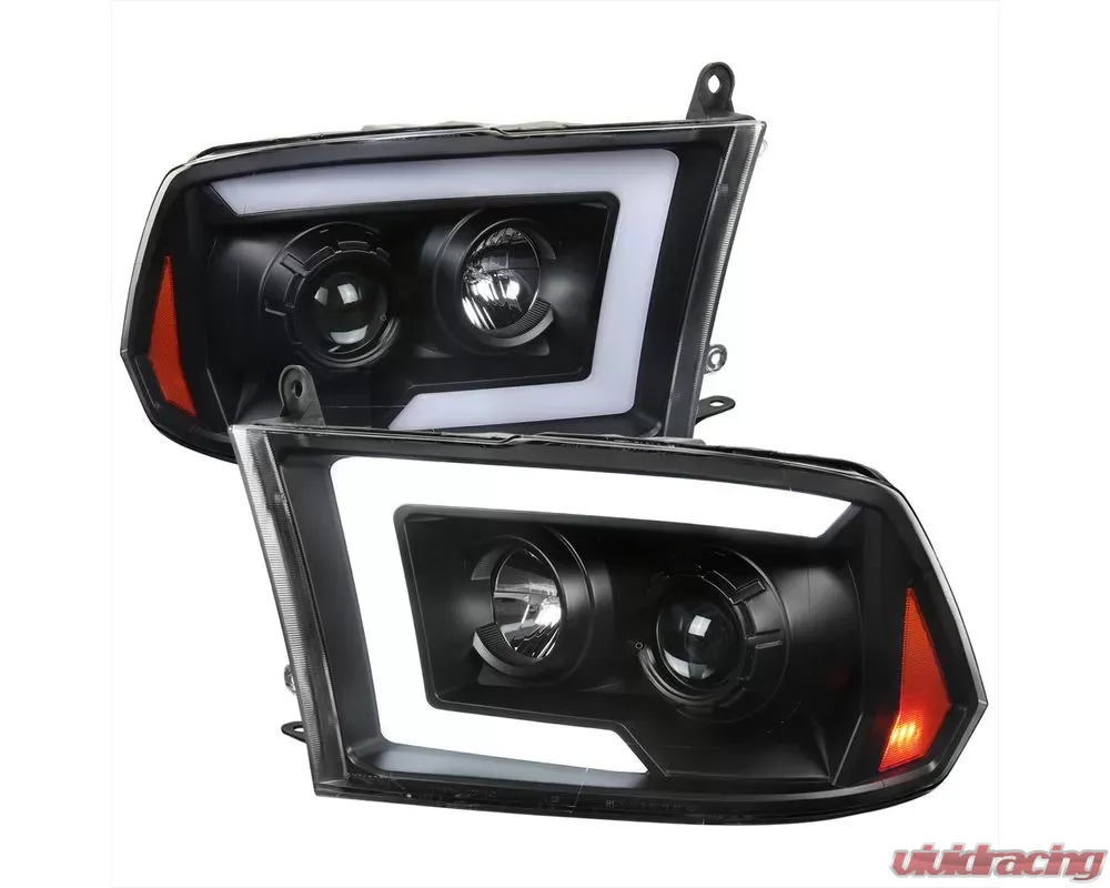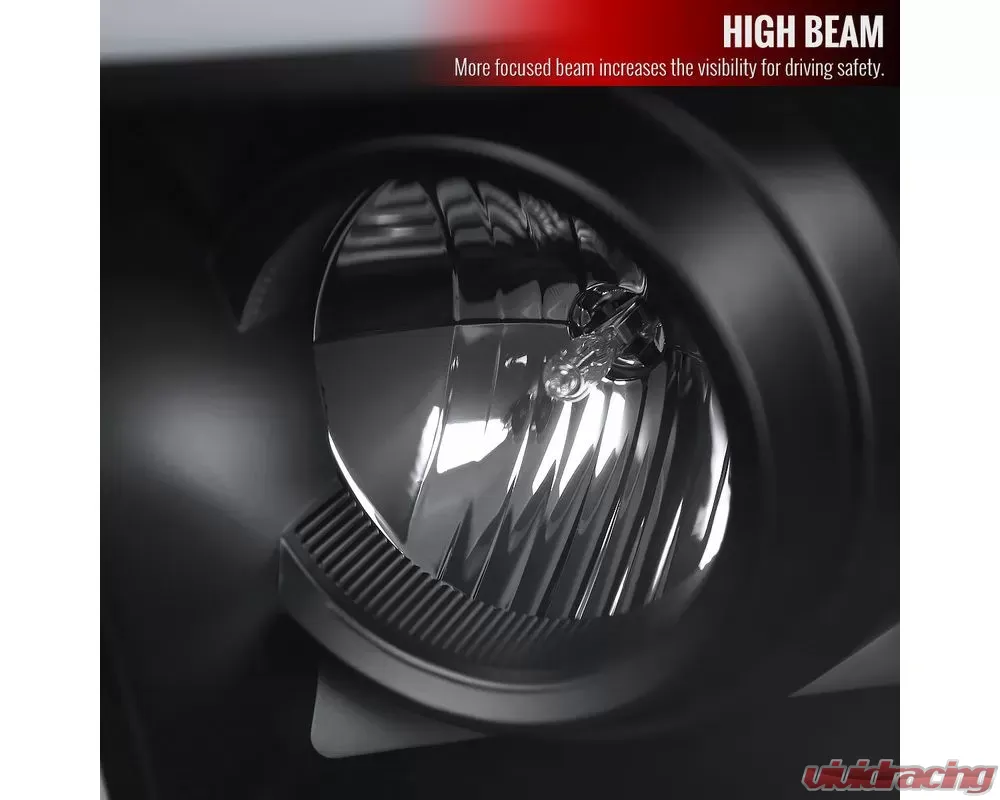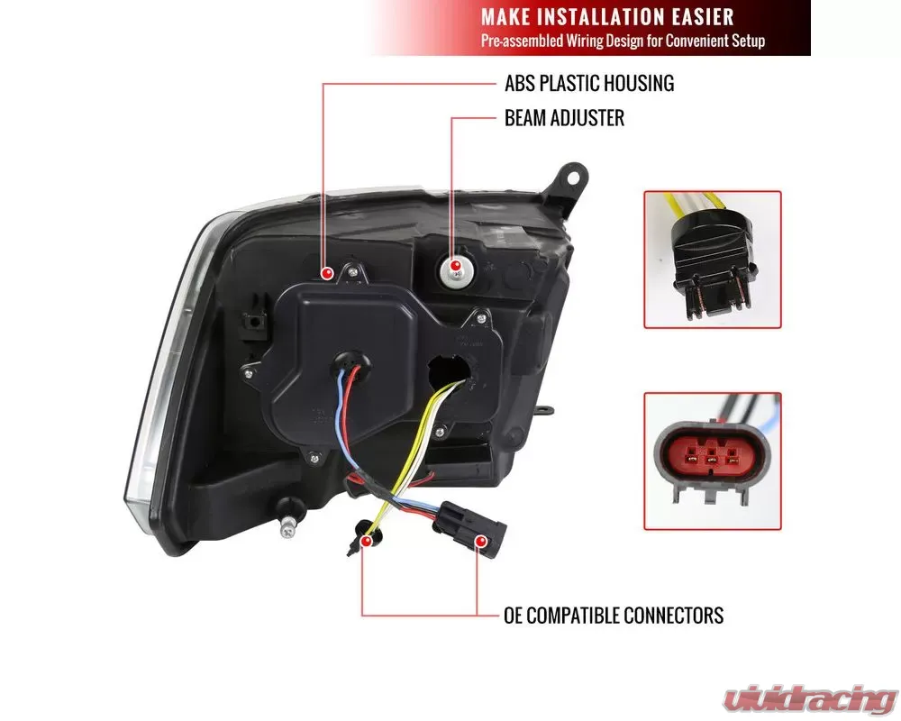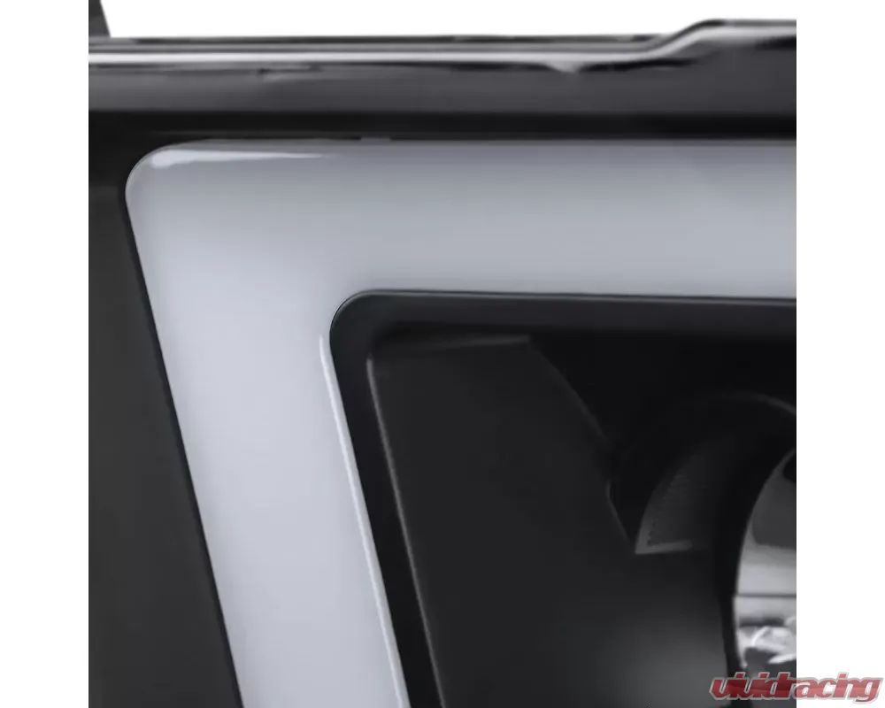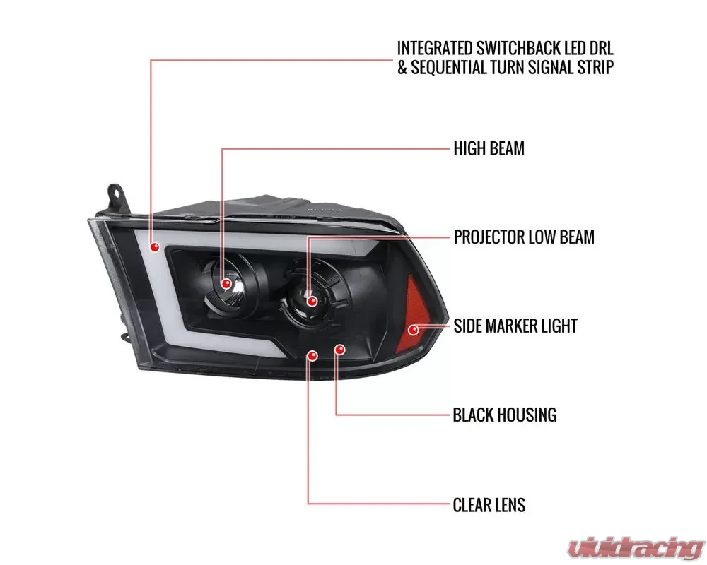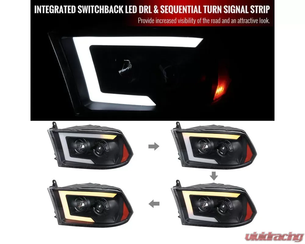 - Includes (1) pair of dual projector style headlights with switchback, sequential LED turn signal in matte black housing with clear lens